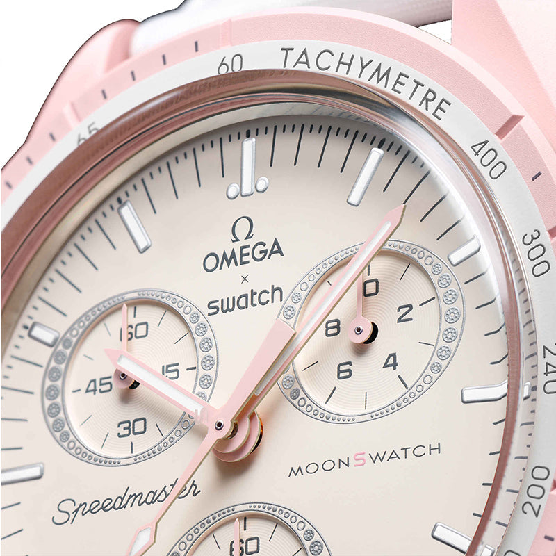ホワイトのVELCRO©ストラップが薄いパステルピンクをパーフェクトに引き立てるくっきり大胆な時計。エッジにはダイヤモンドのようなディテールで飾られた楕円形のサブダイアルが女性らしいエレガントさのタッチを付け加えます。時針、分針、クロノグラフの秒針、そしてカウンターの針もピンクです。 すべての文字盤には、OMEGA X SWATCHの文字、アイコニックなSpeedmasterのロゴ、そして新しいMoonSwatchのロゴが見られます。ガラス構造にはクリスタルの中央に隠れたSの字が統合。文字盤の外側のリングとサブダイアルには繊細で洗練された円の模様、シャープでスムーズなラグ構造、タキメーターの目盛が付いたベゼルにはアイコニックな「ドットオーバー90」のディテール、そしてもちろんユニークなBioceramicのタッチ。これらが全モデルに共通で、ディテールを愛する情熱を表わしています。すべての時針、分針、クロノグラフの秒針、そして時間のマーカーにスーパールミノバが施されているので、暗闇でパーフェクトに光ります。